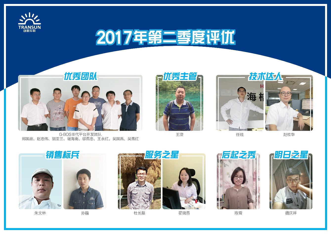 7月31號,第二季度優秀員工評選活動已圓滿落下帷幕,經過一輪輪的篩選,一批優秀員工登上了光榮榜:優秀團隊G-BOSⅢ代平臺開發團隊、優秀主管王澄、技術達人任銳和趙桂華、銷售標兵朱文林和孫巍、服務之星杜長磊和翟曉燕、后起之秀陳雪、明日之星魏慶祥,在此,我們一睹他們的風采。