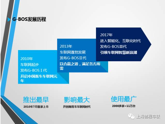 經歷了公司成立之初的艱辛砥礪后,上海創程于2013年5月22日在北京上市發布G-BOS智慧運營系統II代,與其他類似產品一個顯著不同之處是實現了“三合規”:一是通過了公安部CCC檢測認證、交通運輸部部標認證;二是GPS/北斗雙模終端率先通過交通運輸部部標認證,成為客車行業首家;三是率先通過交通運輸部平臺符合性檢測,這也是客車行業首家。G-BOS智慧運營系統II代獨創性地提出了“帶機入網”的業務模式,啟動深藍計劃,與國內各地的GPS運營商建立并展開廣泛合作,著力于解決G-BOS的落地接入問題,為G-BOS的商業運營奠定了堅實的基礎。