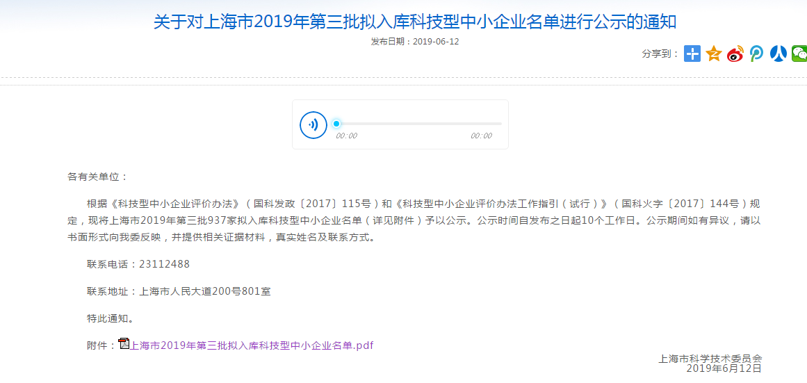 2019年6月26日,我司已過公示期正式入庫上海市科技型中小企業(yè)名單。根據科技部、財政部、國家稅務總局《科技型中小企業(yè)評價辦法》(國科發(fā)政〔2017〕115號)、科技部火炬中心《科技型中小企業(yè)評價辦法工作指引(試行)》(國科火字〔2017〕144號)要求,經區(qū)評價機構審核及市科委的批準,我司成功入庫上海市2019年第三批科技型中小企業(yè)名單。