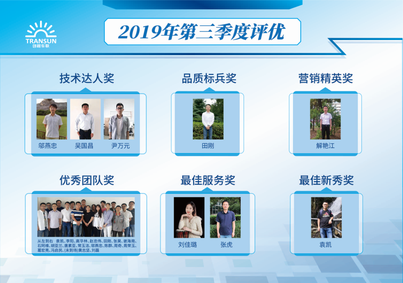 優秀團隊蘇公交項目團隊,技術達人鄔燕忠、吳國昌、尹萬元,最佳服務劉佳璐,張虎,品質標兵田剛,最佳新秀袁凱,營銷精英解艷江,他們在這一季度中團結協作、積極創新、勤勤懇懇,為公司發展做出貢獻,下面讓我們一睹他們的風采。