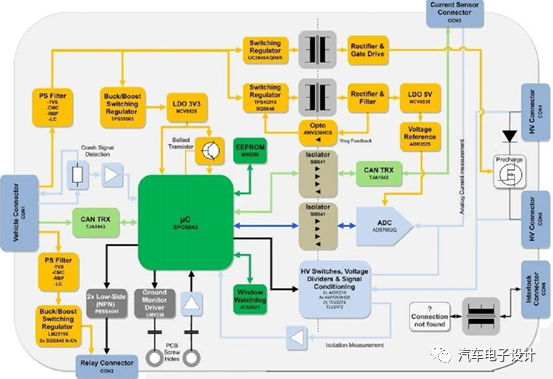 5)電源管理電路和EMC抑制:電池管理系統(tǒng)從電池模組和12V電池上驅(qū)電,通過(guò)合理的保護(hù)電路來(lái)管控不同節(jié)點(diǎn)的電源情況。