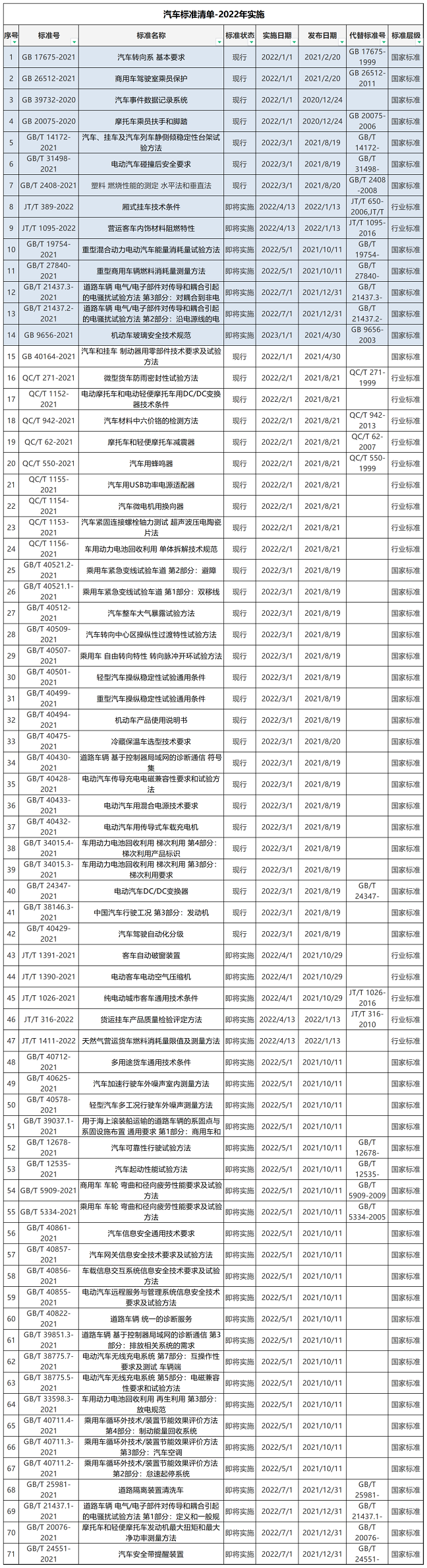 自2022年1月1日起,14項強檢汽車標準和57項非強檢汽車標準開始實施。現對2022年1月1日起正式實施的汽車標準進行了整理匯編,供大家參考。