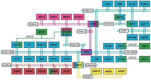 CAN A。車載智能信息系統 (CAN);CAN C. 發動機控制器區域網絡 (CAN);CAN C1. 傳動系統控制器區域網絡 (CAN);CAN D. 診斷控制器區域網絡(CAN);CAN HMI. 用戶界面控制器區域網絡 (CAN);CAN I. 傳動系傳感器控制器區域網絡 (CAN);CAN L. 混合動力控制器區域網絡 (CAN);CAN PER. 外圍設備控制器區域網絡 (CAN);Ethernet. 以太網;Flex E. 底盤 FlexRay;LIN E2. 座椅承載識別區域互聯網 (LIN);LIN G1. 左側大燈局域互聯網 (LIN);G2. 右側大燈局域互聯網 (LIN);MOST. 多媒體傳輸系統。2. 車際網絡