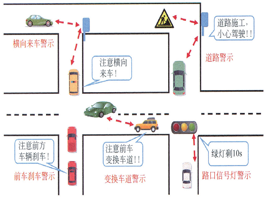 DSRC是基于美國電氣電子工程師協會(IEEE),在IEEE802.11 的Wi-Fi技術基礎上改進制定的IEEE802.11p標準和IEEE1609標準的V2V和V2I通信協議,是比較成熟、高效的無線通信系統技術,它是智能交通系統的重要基礎之一,目前已被歐洲、日本等國汽車制造企業采用并完善。我國在高速公不停車收費設備(ETC)也采用該項技術。DSRC通信在5.9GHz附近的頻段上,專門將車與車、車與道路基礎設施有機連接,實現在數百米的范圍內對高速行駛的車輛進行識別和雙向通信,提供實時圖像、語音和數據信息傳輸,保證通信鏈路的低時延和低干擾以及系統的可靠性。例如DSRC在有效通信距離范圍內,本車輛通過DSRC以10Hz的頻率,向路上其他車輛發送位置、車速、方向等信息;同時本車輛還能收到其他車輛所發出的信號,在必要時(例如馬路轉角有車輛駛出,或前方車輛突然緊急剎車,變換車道的情況發生)車內信號裝置會以閃爍、語音提醒或座椅、方向盤振動等方式提醒駕駛員注意,采取必要安全措施,如圖9所示。