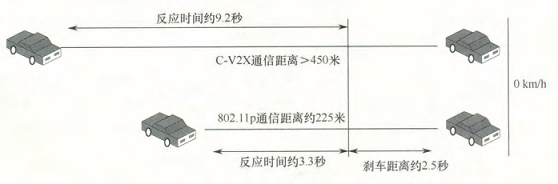 圖中例子是汽車以140km/h速度行駛的時候,采用LTE-V2X的汽車比采用DSRC技術的汽車擁有額外的5.9s(9.2s~3.3s)來決定是否剎車。
