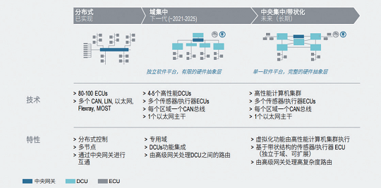 2015年,博世提出了眾所周知的電子電氣架構技術路線圖, 并描繪了未來電子架構的主要特征及可能的實現時間點。對于這一路線圖本身無需再做過多介紹,但其中的兩個重要標志性節點依然值得強調,即DCU或HPC的出現,以及統一的基礎軟件平臺的出現,標志著EEA的本質進化。盡管由于車企的解決方案各不相同,其對EEA進化的階段定義可能有所不同,但羅蘭貝格認為EEA的發展整體會經歷三大階段:分布式架構、基于域的集中式架構和基于域融合的帶狀架構,如圖4。