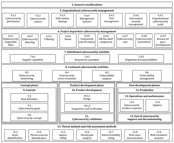 ISO/SAE 21434由15章組成,主題部分為4~15章,包括組織及項目層級的網(wǎng)絡(luò)安全管理,客戶與供應(yīng)商之間的職責(zé)分配,對量產(chǎn)后網(wǎng)絡(luò)安全的持續(xù)監(jiān)測分析,第9~14章描述了從概念設(shè)計階段到產(chǎn)品開發(fā),驗證,生產(chǎn)及運維和報廢的全生命周期的網(wǎng)絡(luò)活動和相關(guān)要求。在最后一章,標(biāo)準(zhǔn)提供了一套網(wǎng)絡(luò)安全威脅分析,風(fēng)險評估的方法論(TARA)。
