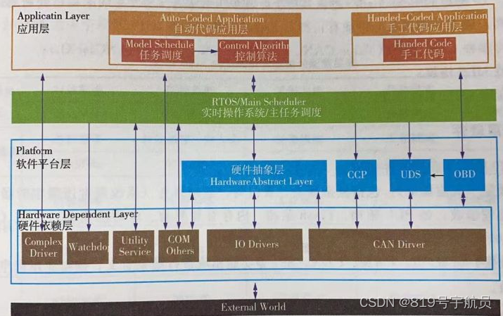 硬件依賴層(底層驅(qū)動):包括復(fù)雜驅(qū)動、看門狗、基礎(chǔ)服務(wù)(系統(tǒng)調(diào)度所需定時(shí)器、中斷管理和一些通用處理函數(shù),如PLL驅(qū)動、Flash驅(qū)動、內(nèi)存管理驅(qū)動、定時(shí)器驅(qū)動)、IO、CAN等其他驅(qū)動。