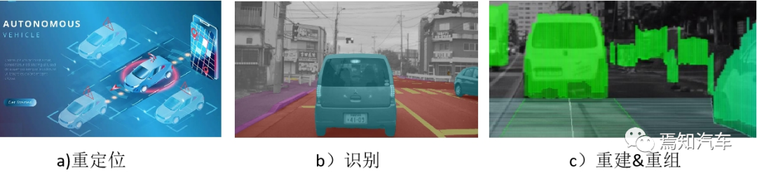 “場景重建”意味著從視頻序列推斷場景中的幾何體,包括車輛在場景中的位置。“要素識別”是一個術語,用于將語義標簽附加到視頻圖像或場景的各個識別對象中,識別中包括各種不同的層次結構。“自車重新定位”是指車輛相對于其周圍環境的位置識別和度量定位。“關鍵目標重組”是將重定位、識別、重建形成的三個組成部分信息重新整合成統一表示的方法。