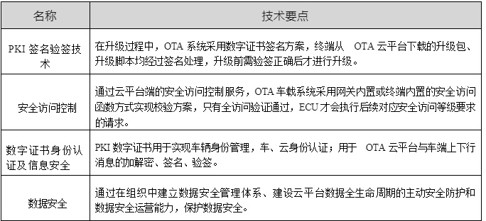 OTA 服務端以及企業 IT 管理系統、安全服務端、web 控制臺、文件服務端 等關聯系統,會面臨傳統云平臺的所有安全威脅。為保證 OTA 升級的安全性,常用安全技術如表 2-5 所示。
