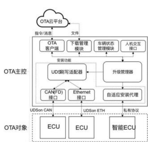 ② 私有協(xié)議:除了升級遵從標準協(xié)議的傳統(tǒng)控制器,OTA 還需要支持智能 ECU 的升級。智能 ECU 通常帶有操作系統(tǒng)并且自身具有升級能力,作為升級對象,需要從 OTA 主控模塊或者云端獲取升級包,并與 OTA 主控進行信息交互,實現(xiàn)升級的觸發(fā)和升級信息的反饋。對于這部分升級所涉及到的升級包分發(fā)和升級控制,現(xiàn)在并沒有統(tǒng)一的定義和標準,各家車企和供應商的實現(xiàn)方案也各異。