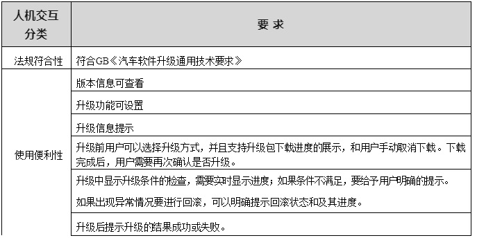 車端的人機交互主要體現(xiàn)在信息娛樂系統(tǒng)上,覆蓋到 OTA 的整個過程,包括信息提示、用戶確認、關鍵信息顯示等。人機交互過程需要考慮的要素大致可以分為兩個方面,即法規(guī)符合性和使用便利性,如表 2-8 所示。