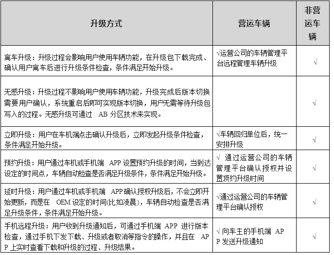 基于實際業(yè)務要求,各家 OEM 的 OTA 人機交互方式各有差異,本節(jié)共總結 6 種主流升級方式,并針對營運車輛與非營運車輛使用性質不同,分別展開分析,具體如表 2-10 所示。
