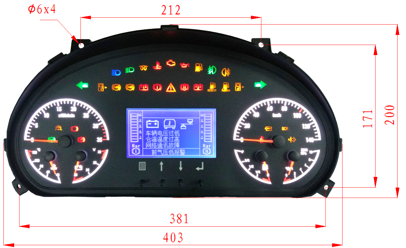 - 6個步進電機驅動的指針表盤 - 30個LED符號片 - 多個TFT符號片 - 5寸TFT單色屏 - 一個多音頻蜂鳴器 |